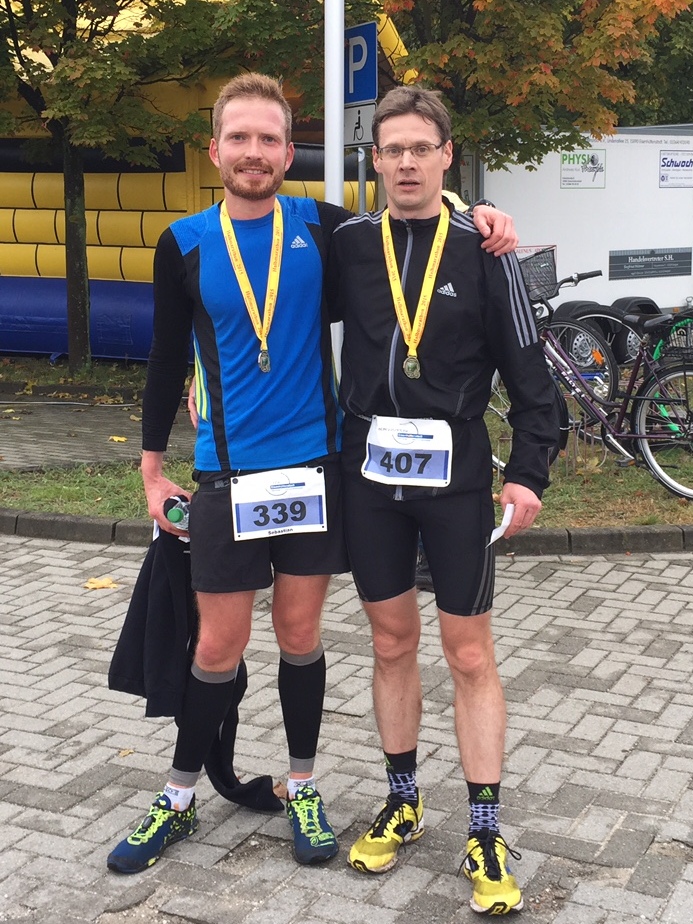Nach den Regenfällen der vergangen Tage blieb es am Wettkampftag trocken, jedoch waren die ohnehin schon anspruchsvollen Cross-Strecken rund um Eisenhüttenstadt ziemlich aufgeweicht. Vom Start weg konnten sich Thomas und Sebastian im vorderen Läuferfeld festbeißen. Nach zwei flachen Kilometern zum eingewöhnen, ging es steil bergauf in die Diehloer Berge. Hatte sich Sebastian noch im letzten Jahr auf den Waldwegen verlaufen, so erreichte er diesmal das Ziel ohne zusätzliche Umwege. Mit einer Zeit von 1:29:27 kam er als 4. der Gesamtwertung ins Ziel und konnte damit seine Altersklasse gewinnen. Nur kurze Zeit später überquerte Thomas als 6. die Ziellinie. Eine Zeit von 1:30:11 ließ auch ihn ganz oben auf dem Altersklassenpodest stehen.