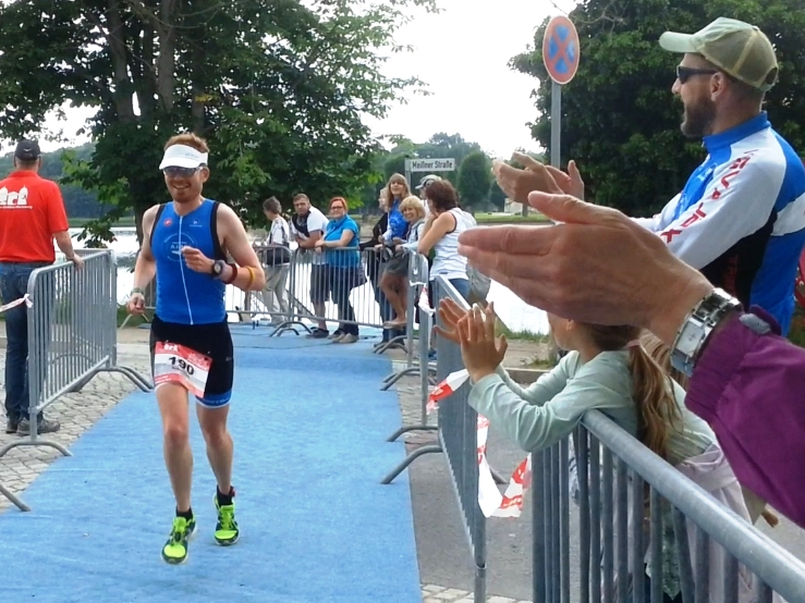 10  Minuten nach den Staffelteams wurde die Startkanone für die Einzelathleten gezündet. Nach dem üblichen Gemetzel am Schwimmstart, konnte Sebastian seinen Rhythmus finden und stieg nach 30:39 min als 42. aus dem Schlossteich. Im Vergleich zum Vorjahr konnte auch die Radzeit um 5 min auf 2:27:52 h verbessert werden. Mit der Aussicht auf eine neue Bestzeit ging es dann hoch motiviert auf die Laufstrecke. Auch wenn die Beine auf den letzten 2 Runden ziemlich schwer wurden, kam Sebastian nach 4:35:30 h ins Ziel und belegte damit den 48. Gesamtplatz.