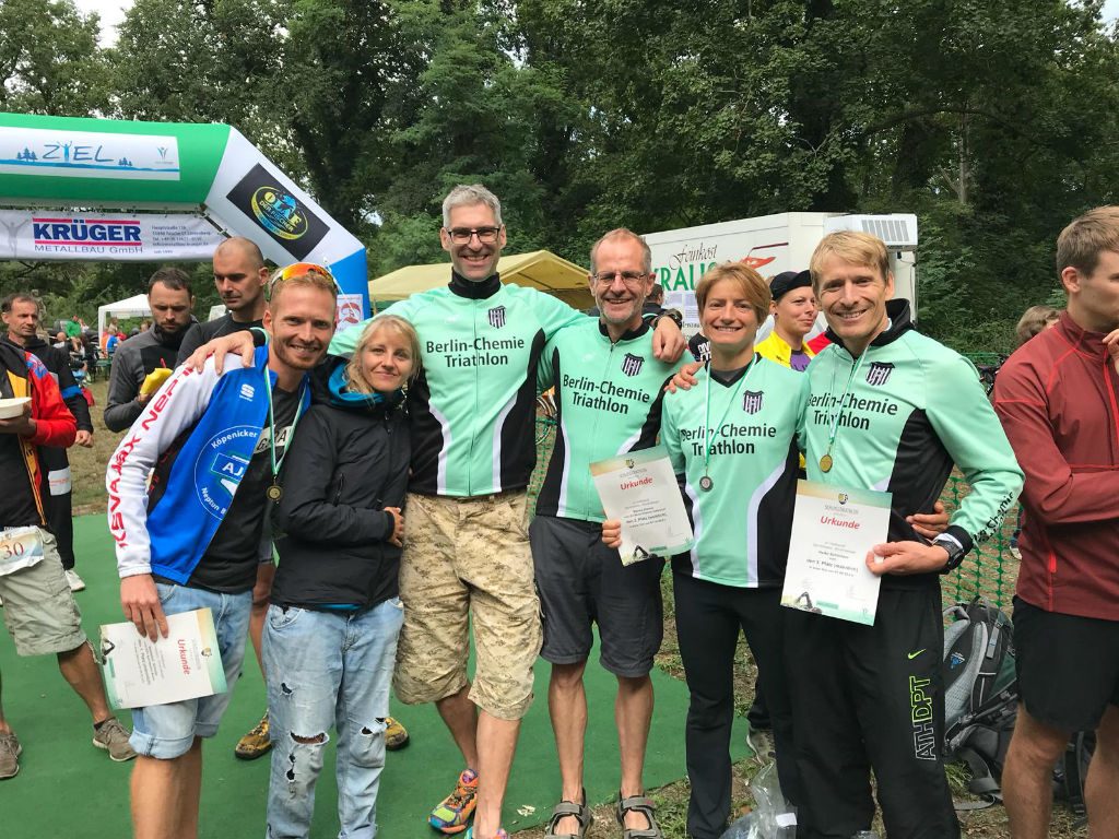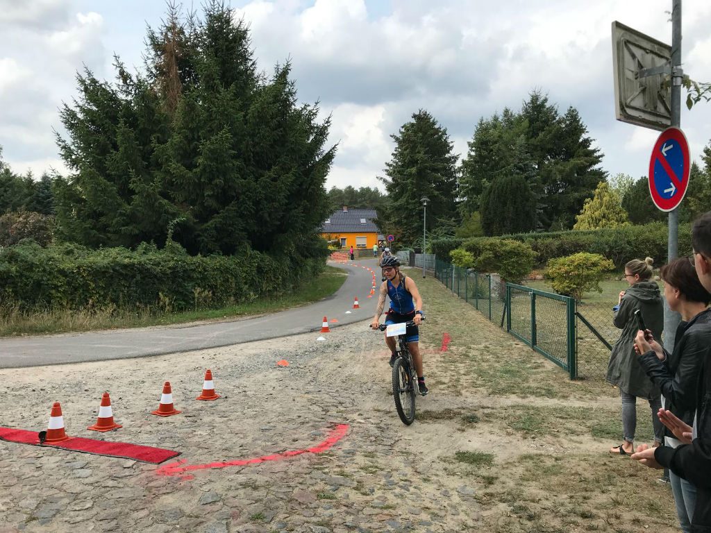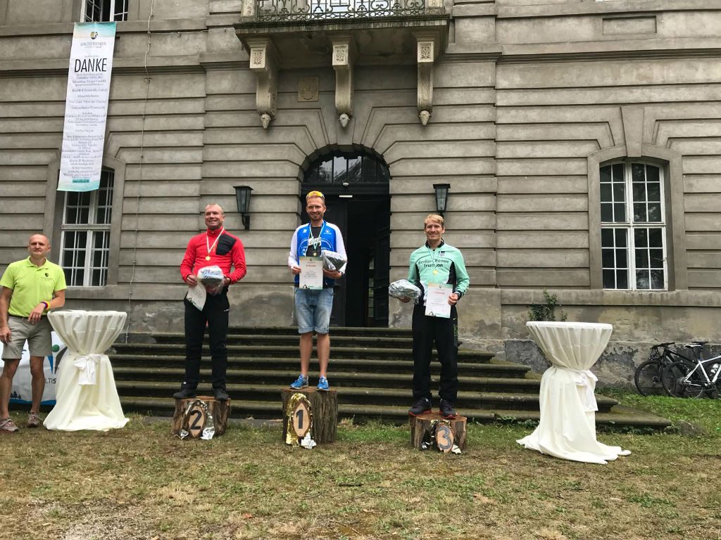 Der Kossenblatter Schlosstriathlon fand am Samstag den 24.08 mit über 130 Teilnehmern nun schon im dritten Jahr statt. Gestartet wurde auf der Volks-, Sprint- und Kurzdistanz wobei Letztere als Brandenburgische Landesmeisterschaft ausgetragen wurde. Anne und Sebastian starteten den Crosstriathlon auf der Sprintdistanz über 1km Schwimmen in der Spree, 13km Mountainbiken und 5km Laufen rund um das Kossenblatter Schloss. Die Schwimmstrecke führte zuerst stromabwärts und sorgte für ein fantastisches Schwimmgefühl. Dies änderte sich jedoch schlagartig, als nach einer 180° Wende auch ein kurzes Stück gegen den Strom absolviert werden musste. Allerdings fiel die Quälerei flussaufwärts deutlich humaner aus als im letzten Jahr, da der Wasserstand aufgrund der sommerliche Hitze fast das Laufen erlaubte. Sebastian konnte schon im Schwimmen eine kleine Lücke zum Verfolgerfeld reißen und die Führung bis ins Ziel verteidigen. Mit einer Zeit von 01:07:51h holte er den Gesamtsieg auf der Sprintdistanz. Anne kam ebenfalls mit einer hervorragenden Schwimmzeit aus dem Wasser, verlor allerdings beim Kampf mit ihrem Neopren ein paar Plätze in der Wechselzone. Dennoch schaffte sie mit einer Zeit von 01:39:14h den Sprung ganz nach ober auf das Altersklassenpodest. Mit Massage und Herfallen über das leckere Zielbuffet fand diese liebevoll organisierte und familiäre Veranstaltung ihren Ausklang