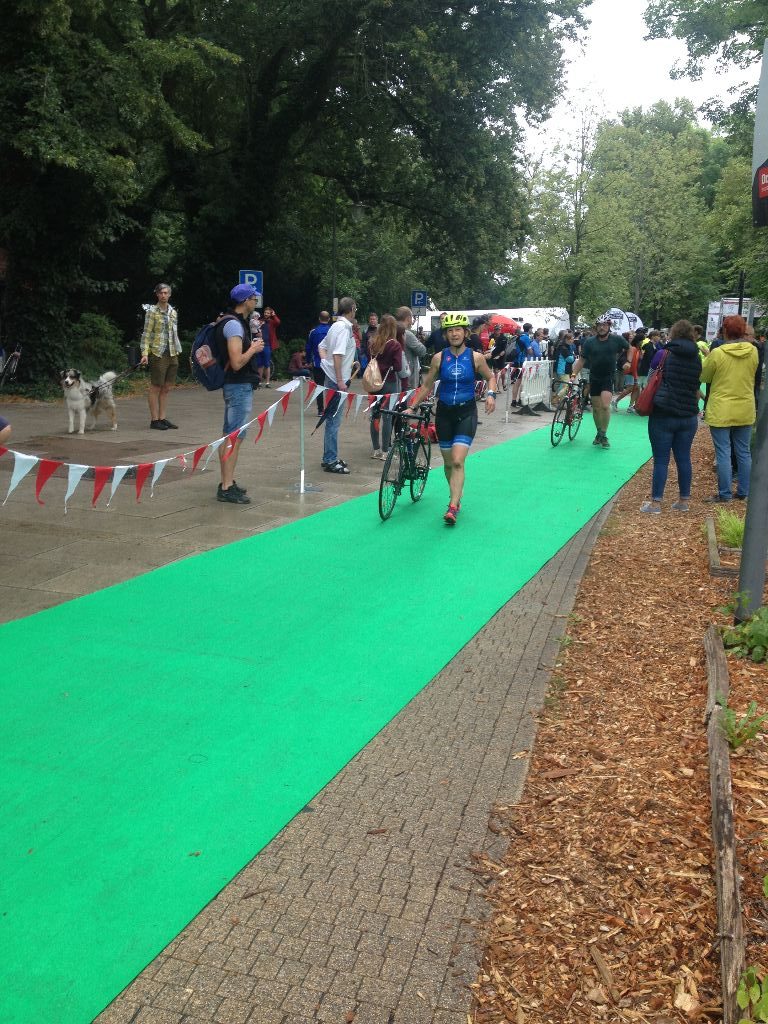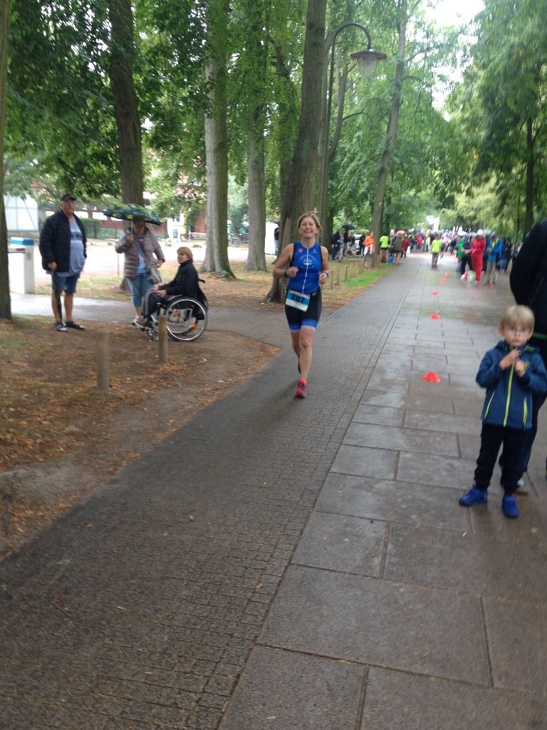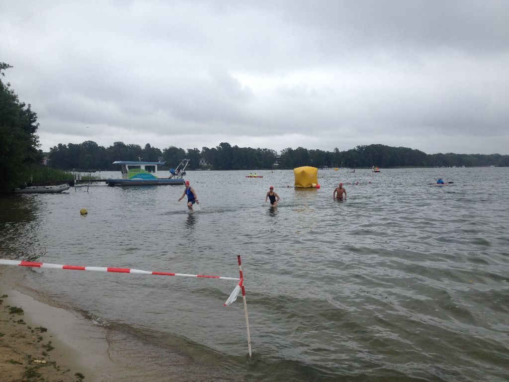 Auf der Suche nach freien Wettkampfplätzen in Wohnortnähe in der Sprintdistanz wurde ich beim ersten Scharmützelsee Triathlon in Bad Saarow fündig und hatte mich angemeldet. Am 18.08. war es dann soweit, kurz nachdem Anne eingetroffen war, um mich kräftig anzufeuern, ging es um 10:10 Uhr für mich mit der zweiten Startwelle los. Der Weg aus dem Wasser zum Rad war angenehm kurz, nach der etwas längeren Radschiebestrecke ging es dann auf den 23 km langen Radrundkurs über Reichenwalde und Wendisch Rietz zurück nach Bad Saarow. Bis auf einen kurzen Anstieg am Anfang war die Strecke eher flach bis leicht hügelig und sehr gut asphaltiert. Die anschließende Laufstrecke durch den Ort hat mir ebenfalls Spaß gemacht. Der mal mehr mal weniger starke Nieselregen, der mich den ganzen Wettkampf begleitet hat, war für mich sehr angenehm, so dass ich meine Laufzeit verbessert habe.